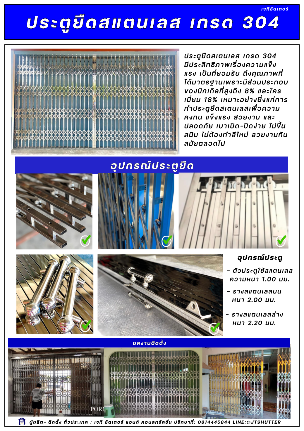 ประตูยืดสเตนเลส เกรด 304 โดยปกติการใช้งานจะเหมือนกับประตูเหล็กยืดทั่วไป โดย ประตูยืดสเตนเลส เกรด 304 โดยทั่วไปแต่ยังคงประสิทธิภาพ ความแข็งแรง การใช้งานที่ง่าย จนเป็นที่ยอมรับ อย่างแพร่หลายถึงคุณภาพ การใช้งานที่ได้มาตรฐานโดยโรงงานของเราเป็นผู้ผลิตคำนึงถึงคุณภาพการใช้งานเป็นอันดับ1